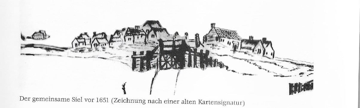 Erbaut 1619 aus Holz / 1640 Sielreparatur / 1796 Neues Siel aus Holz / 1891 Sielneubau, massiv aus Ziegelstein / 1967 Sielneubau mit 2 Öffnungen ( Schiebesiel )